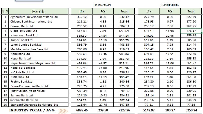 ग्लोबलको निक्षेप संगै कर्जा लगानी पनि सबैभन्दा बढी भएको देखिन्छ । यसले ४ खर्ब ७ट अर्ब बढी ऋण लगानी गरेको छ । ग्लोबलपछि सबैभन्दा धेरै नबिल बैंकले निक्षेप संकलन गरेको छ । नबिलको चैत मसान्तसम्ममा ५ खर्ब ८८ अर्ब रुपैयाँभन्दा बढी निक्षेप संकलन भएको छ । कर्जा लगानी ४ खर्ब ७२ अर्ब रुपैयाँ रहेको छ ।